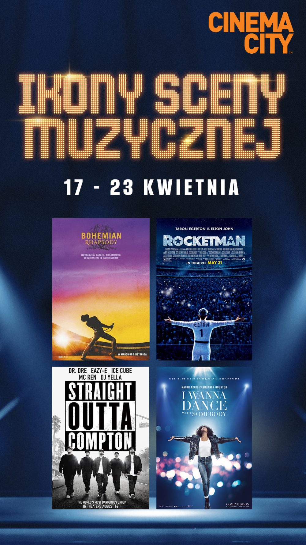 Kwiecień w Cinema City zapowiada się jak prawdziwy festiwal muzycznych ikon. Na wielki ekran powracają filmowe hity opowiadające o życiu i karierze legendarnych artystów – ,,Bohemian Rhapsody”, ,,Rocketman”, ,,Straight Outta Compton” oraz ,,I Wanna Dance with Somebody”. To jedyna okazja, by ponownie przeżyć te produkcje w kinie i zanurzyć się w emocjonalnych historiach wypełnionych muzyką po brzegi. Z kolei już 22 kwietnia na ekranach Cinema City zawita długo wyczekiwany film biograficzny o Michaelu Jacksonie.