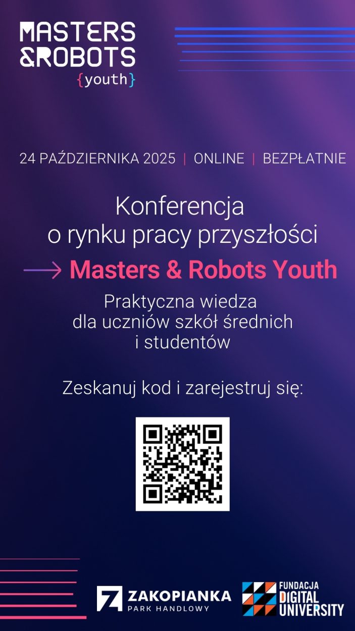 Masters&Robots YOUTH 2025 to wyjątkowa, bezpłatna konferencja online dla uczennic i uczniów szkół średnich oraz studentek i studentów z całej Polski.